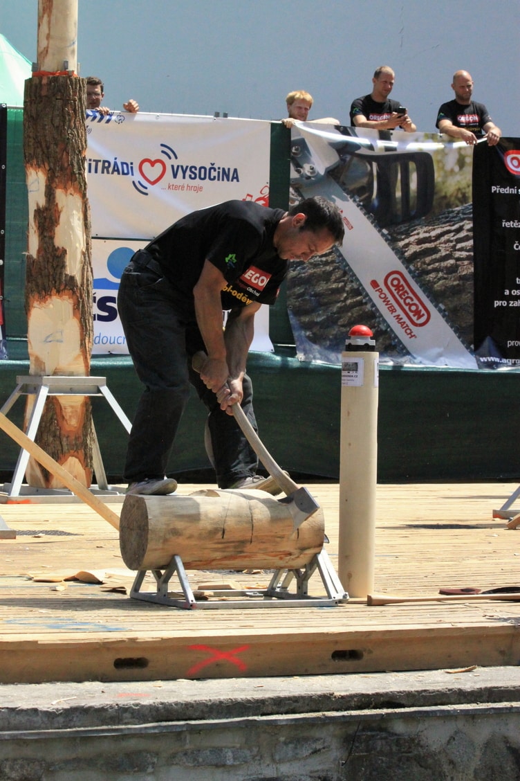 Závodník stojí na špalku o průměru 30 cm, který je uchycen na ležato ve speciálním stojanu. Závodník musí špalek co nejrychleji přesekat. Sekat musí vždy z obou stran v protoru mezi nohama. Před zahájením si smí na špalku vysekat plochy pro nohy, aby se mu lépe stálo, pokud však do nich sekne při přesekávání špalku, znamená to diskvalifikaci.Závodník stojí na špalku o průměru 30 cm, který je uchycen na ležato ve speciálním stojanu. Závodník musí špalek co nejrychleji přesekat. Sekat musí vždy z obou stran v protoru mezi nohama. Před zahájením si smí na špalku vysekat plochy pro nohy, aby se mu lépe stálo, pokud však do nich sekne při přesekávání špalku, znamená to diskvalifikaci.